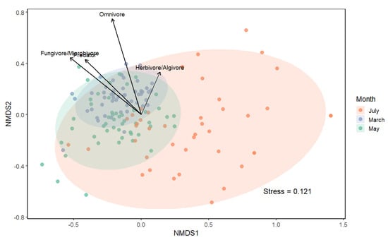 Non-metric multidimensional scaling (NMDS) ordination of moss-dwelling mite communities based on trophic guild abundances (Bray–Curtis distance). Points represent individual samples, ellipses denote 95% confidence intervals for each month, and vectors show trophic groups fitted by envfit.