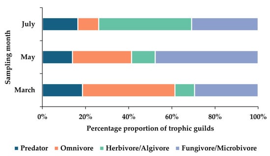 Relative abundance of trophic guilds of moss-dwelling mites across sampling months (March, May, July). Bars represent the proportional contribution of each trophic group (Predator, Omnivore, Herbivore/Algivore, Fungivore/Microbivore) to the total community in each month.
