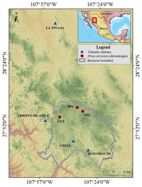 Location of the study site in the municipality of Bocoyna, Chihuahua and the geographical distribution of the tree ring chronologies and climatic stations used in the study.