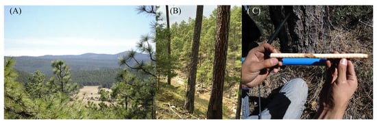 Panoramic view of Pinus arizonica forest (A), old trees selected (B), and samples taken from P. arizonica using Pressler increment borer of a 12 mm diameter (C).