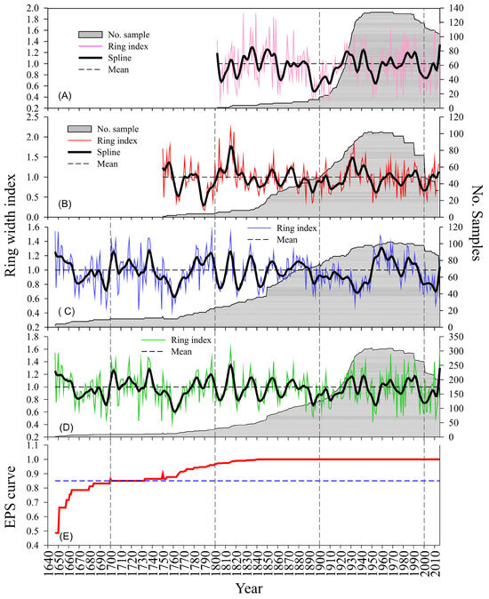 Total tree-ring width residual chronologies generated based on growths for P. arizonica, at (A) Talayotes (TAL), (B) Predio Particular Las Chinas (PPC), (C) El Cuervo (CUE), (D) merged regional chronology based on the three site chronologies from Chihuahua, Mexico and (E) expressed population signal (EPS) curve. The red line shows the variability of the EPS, and the blue dashed line indicates the EPS value = 0.85. The period 1700–2015 of the regional chronology indicates an EPS > 0.85.