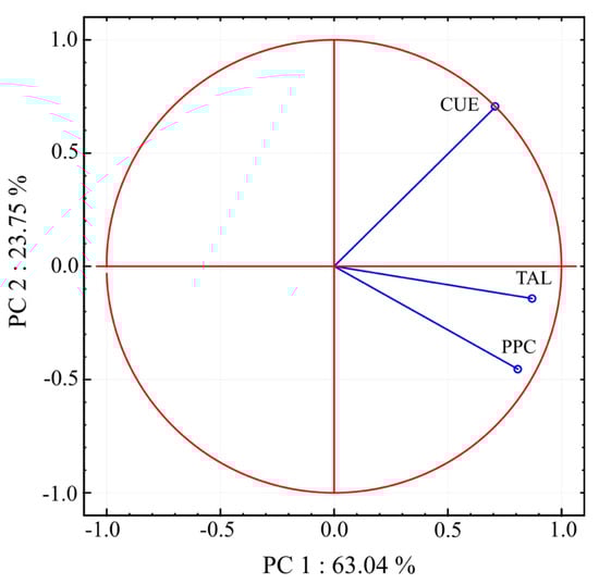 We dated a total of 359 increment cores from 155 P. arizonica trees (Table 1) and generated three chronologies with different temporal lengths (Figure 3, Table 3). The 10% of the samples (38) could not be dated due to growth problems and advanced wood rotting. The PCA results suggest that the three chronologies shared similar variability. That is, the first two principal components explain 86.8% of the variance in growth for the past two centuries (TAL chronology: CP1 = 0.86; CP2 = 0.14; PPC chronology: CP1 = 0.80; CP2 = −0.69 and CUE chronology: CP1 = 0.70; CP2 = 0.45). The three chronologies were grouped into PC1, which explained 63% of the variance (Figure 4). The correlation analysis between tree-ring series (r = 0.58, p < 0.01) also indicated similar response patterns between chronologies, allowing for the integration of the three site chronologies into a single regional chronology spanning 369 years, between 1647 and 2015 (Figure 3D, Table 3). The regional chronology showed high inter-annual and multi-year tree-ring variability for the southwest region of the state of Chihuahua.