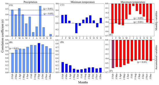 Correlation between P. arizonica tree-ring width index and both monthly as well as cumulative values between January and the corresponding month for average regional precipitation (A,B), minimum temperature (C,D) and maximum temperature (E,F). The period of analysis was between 1981 and 2015, based on records from weather stations in Creel, Huicorachi, Arroyo de Agua and La Tinaja in Chihuahua, Mexico.