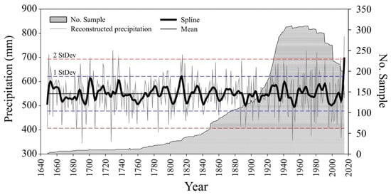 Reconstructed winter–spring precipitation (January–September) from 1647 to 2015. The thin gray line indicates the annual variability, while thick black represents decadal smoothing spline fitted to the annual data emphasizes low frequency variance in the reconstruction. The black horizontal line represents the mean (550 mm) and the gray background area indicates the sample size in each segment of the series. The dotted horizontal lines above and below the mean in blue and red color indicate one and two standard deviations, respectively. The wettest years (>700 mm) and driest years (<400 mm) are marked in red.