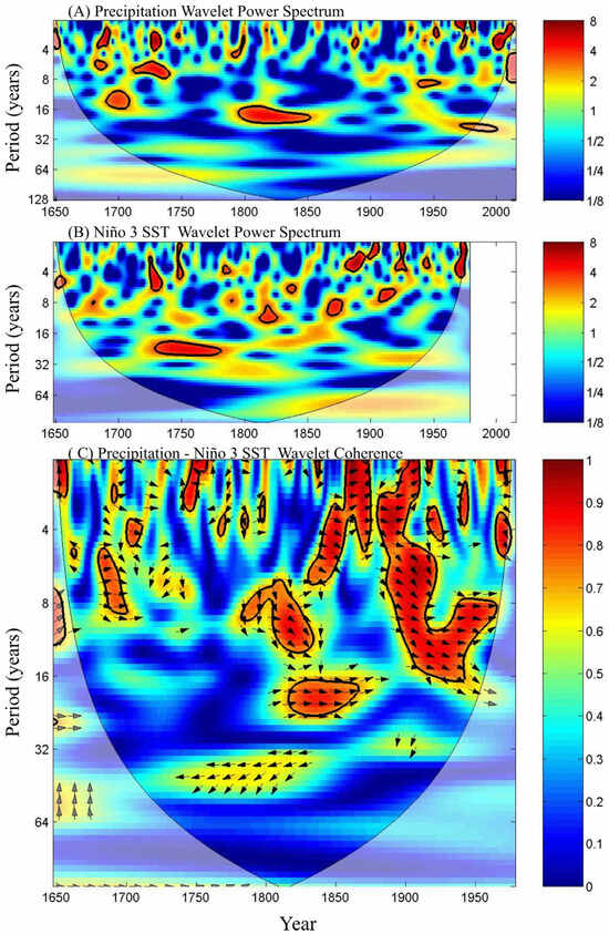 Continuous annual wavelet power spectrum for January–September reconstructed precipitation (A), Niño 3 SST index (B,C) represents the Wavelet Coherence domain between the reconstructed precipitation series and the Niño 3 SST index. The red spots delineated in black represent periods with significant frequencies (p < 0.05), and the arrows pointing to the right indicate that both phenomena are in phase (positive correlation).