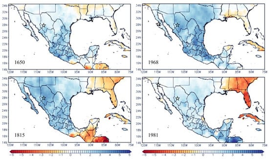 Maps of the climatic condition (PDSI, JJA) for the four years with the highest precipitation records (>700 mm) in the reconstructed period (1647–2015) in southwestern Chihuahua. In each of the four years analyzed, there was synchrony with the warm phase of ENSO (El Niño). The maps were generated based on the MXDA [58].