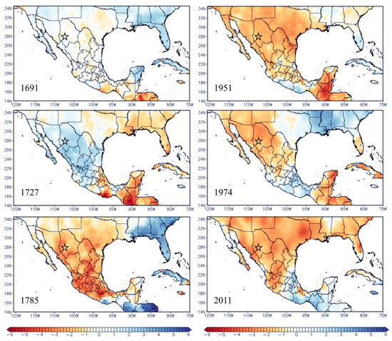 Drought maps (PDSI, JJA) for the six years with the lowest precipitation records (<400 mm) in the reconstructed period (1647–2015) in southwestern Chihuahua. In each of these six years analyzed, there was a synchrony with the cold phase of ENSO (La Niña). The maps were generated based on the MXDA [58].