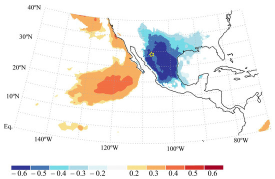Spatial correlation values between the January-September near-surface temperature ERA5 1979–2015 and the precipitation reconstruction, positively correlated to the eastern Pacific Ocean’s near-surface temperature and negatively correlated to the continental temperature. The yellow star represents the study area.