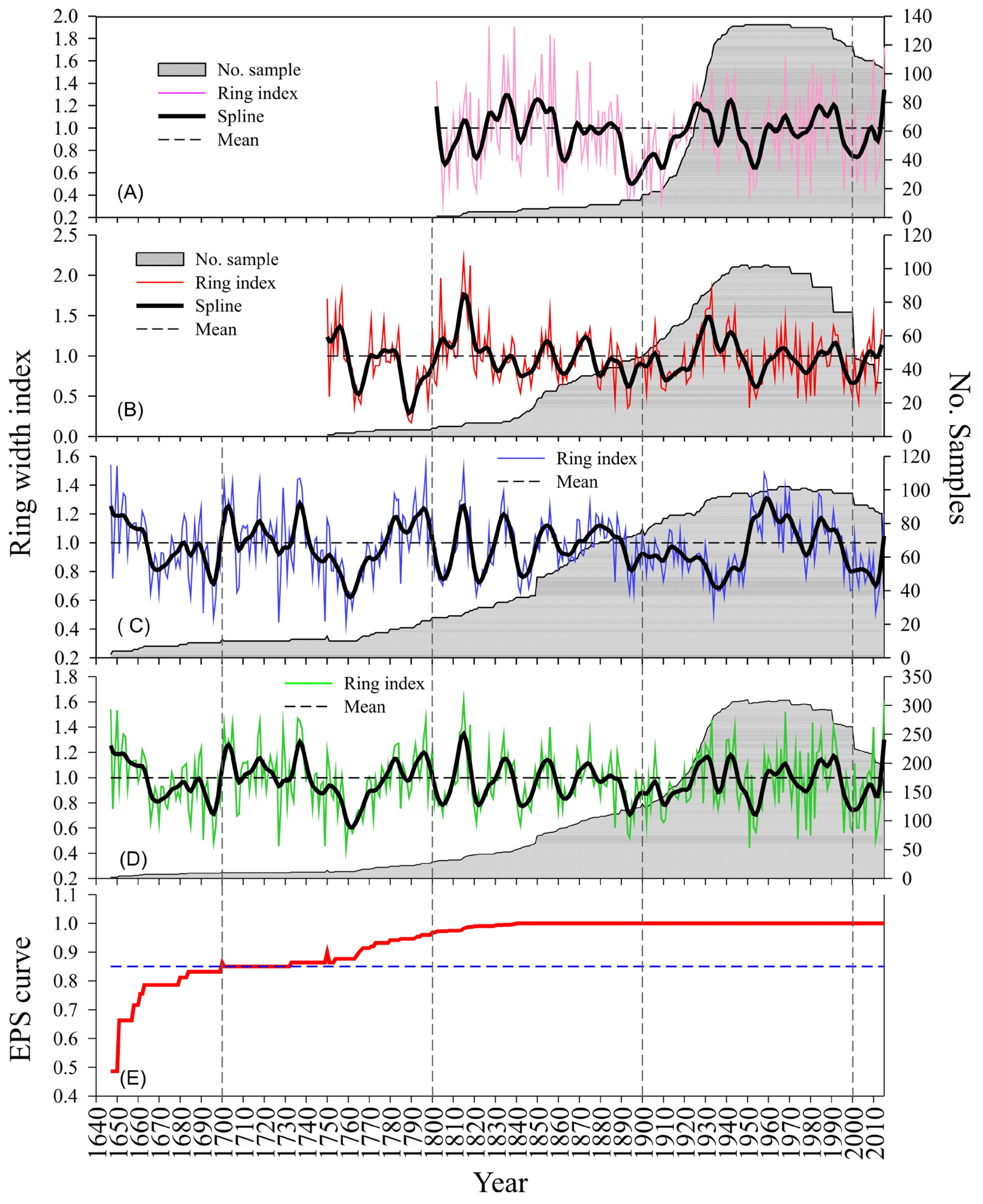 - Cook, E.R.; Peters, K. The smoothing spline: A new approach to standardizing forest interior tree-ring width series for dendroclimatic studies. Tree-Ring Bull. 1981, 41, 45–53. [Google Scholar]