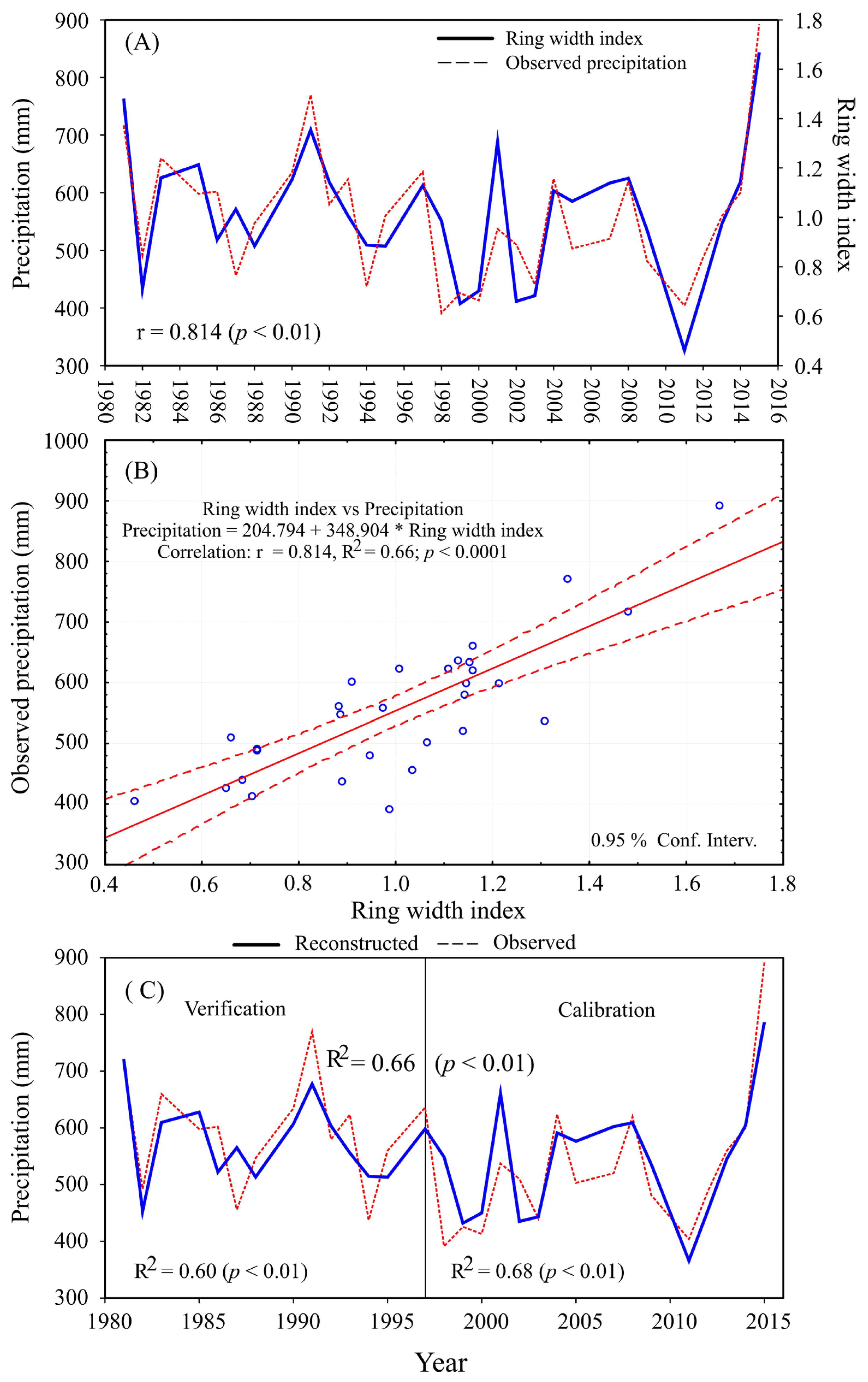 - Fritts, H.C. Reconstructing Large-Scale Climatic Patterns from Tree-Ring Data; University of Arizona Press: Tucson, AZ, USA, 1991; 286p. [Google Scholar]