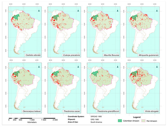 Geographic distribution of eight woody species: Cedrela odorata L., Euterpe precatoria (Mart.) A.J.Hend., Mauritia flexuosa L.f., Minquartia guianensis Aubl., Oenocarpus bataua Mart., Theobroma grandiflorum (Willd. ex Spreng.) Schum., Thebroma cacao L. and Virola elongata (Benth.) Warb. in the Pan-Amazon region (South America). Red dots represent georeferenced occurrence records. The dark green area indicates the Colombian Amazon, while the light green area represents the Pan-Amazon domain used for modeling. The magenta line shows the boundary of the Pan-Amazon region.