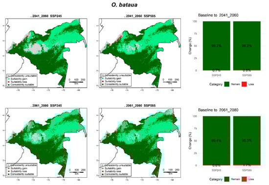 Habitat suitability change for O. batua under SSP245 and SSP585 climatic scenarios for two future periods (2041–2060 and 2061–2080). Suitability-change maps (Δ) depict areas consistently suitable, consistently unsuitable, suitability gain, and suitability loss relative to the baseline (1970–2000). Bar plots on the right show the percentage of changes in suitable habitat area, distinguishing between maintenance and loss under each scenario and period.