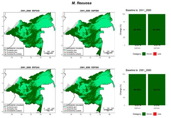 Habitat suitability change for M. flexuosa under SSP245 and SSP585 climatic scenarios for two future periods (2041–2060 and 2061–2080). Suitability-change maps (Δ) depict areas consistently suitable, consistently unsuitable, suitability gain, and suitability loss relative to the baseline (1970–2000). Bar plots on the right show the percentage of changes in suitable habitat area, distinguishing between maintenance and loss under each scenario and period.