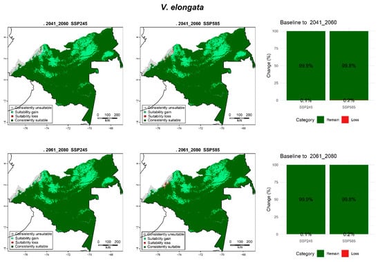 For V. elongata, projections revealed remarkable spatial stability across all scenarios and time periods (Table 3; Figure 5). Under both SSP245 and SSP585, more than 99.8% of baseline suitable area persisted through mid- and late-century periods, with losses remaining negligible (≤0.2%). Consistently suitable habitats were broadly distributed throughout the Colombian Amazon, particularly across central and southern regions, while moderate suitability extended toward the Andean foothills and interfluvial zones. Minor contractions appeared at the northern and southwestern margins under SSP585, whereas slight expansions were observed in the central–eastern lowlands. These subtle spatial shifts suggest a stable but slightly redistributed climatic niche.