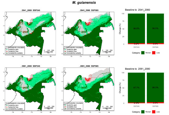Habitat suitability change for M. guianensis under SSP245 and SSP585 climatic scenarios for two future periods (2041–2060 and 2061–2080). Suitability-change maps (Δ) depict areas consistently suitable, consistently unsuitable, suitability gain, and suitability loss relative to the baseline (1970–2000). Bar plots on the right show the percentage of changes in suitable habitat area, distinguishing between maintenance and loss under each scenario and period.