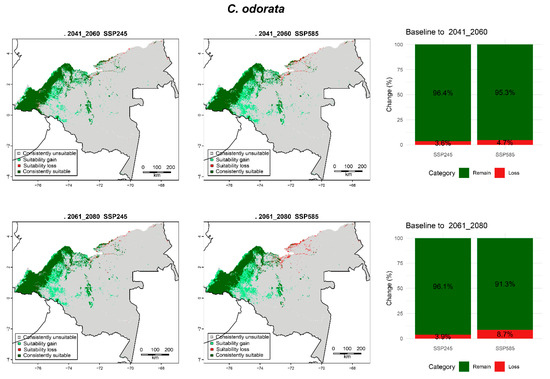 Projections for C. odorata revealed a moderate spatial contraction of suitable habitats, particularly under the high-emission scenario (Table 3; Figure 7). During the mid-century period (2041–2060), suitable areas persisted mainly across the western Amazon and foothill regions, while losses appeared in the northern and eastern regions under both SSP245 and SSP585. By the late century (2061–2080), these reductions intensified, especially under SSP585, where habitat suitability declined by nearly 9%, indicating progressive range retraction toward the southwestern Amazon. Although isolated suitability gains were projected in central and western zones, these failed to offset the pronounced losses along the northern and eastern distribution margins. Overall, C. odorata showed moderate sensitivity to climate change, with persistent but spatially shrinking suitable areas under future conditions. Suitability losses increased slightly toward the late century (~0.5 Mha; ~1%) (Supplementary Figure S8).