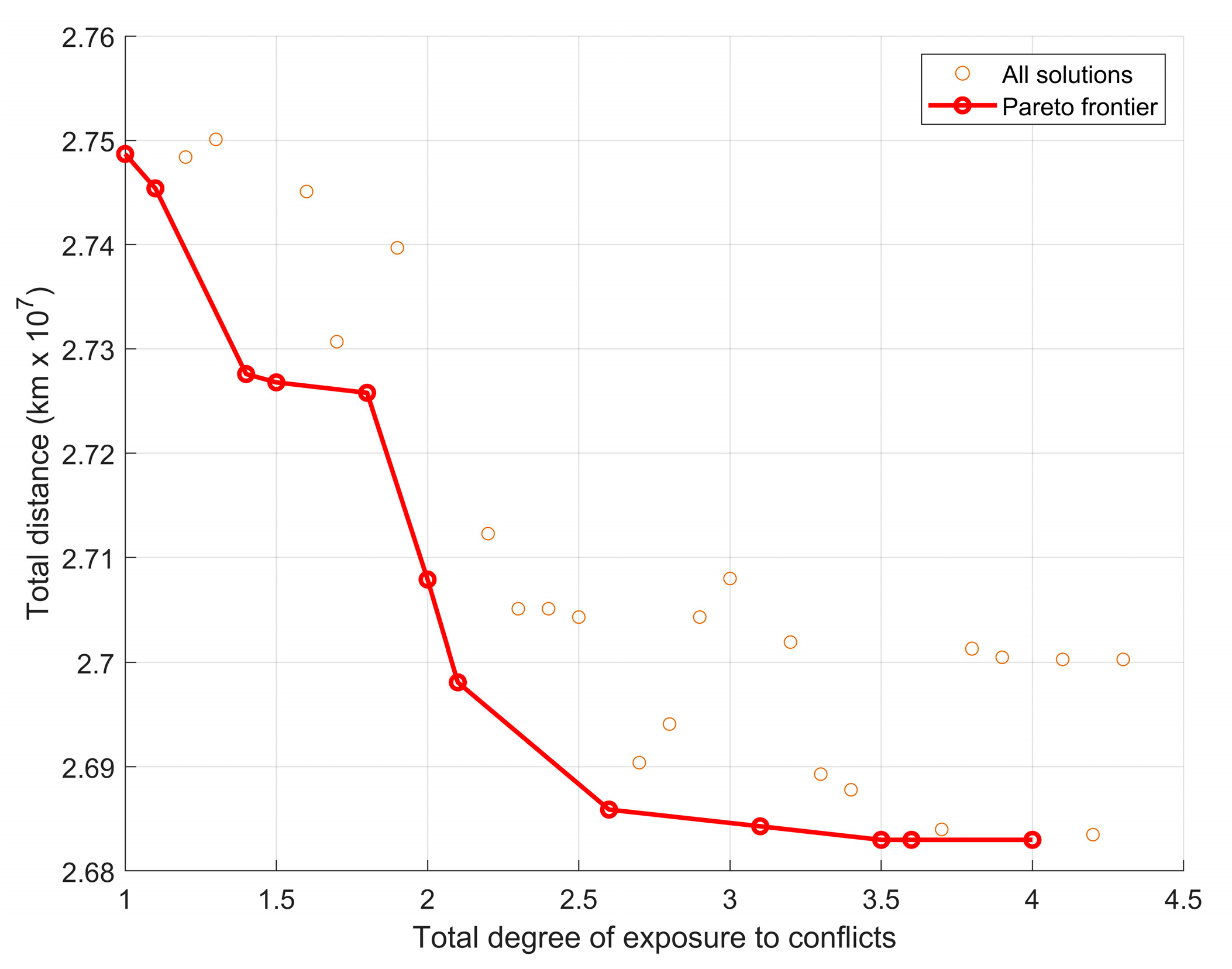 - Experiment I-B: Transportation distance vs. territorial exposure to social conflicts (z2 vs. z3)Objective: Explore trade-offs between minimizing transportation distance (z2) and reducing exposure to social conflicts (z3).Method: ε-constraint with z2 as the primary objective, z3 as the constrained objective.
