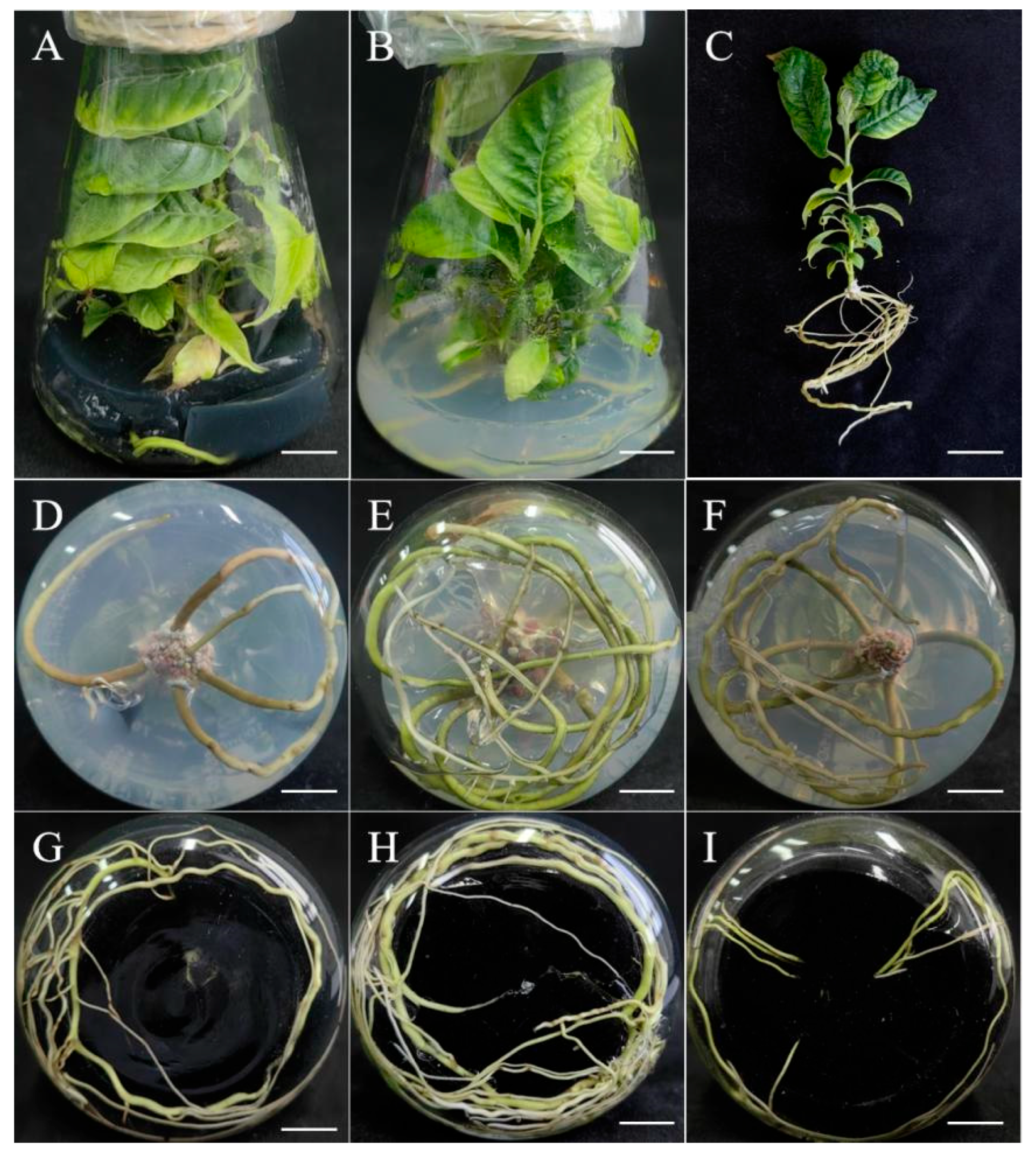 42]. Phloroglucinol supplementation was initiated during Stage II of in vitro camptothecin accumulation, with concentration optimized through preliminary trials. It was observed that phloroglucinol, in interaction with auxins, promoted the initiation of adventitious roots in