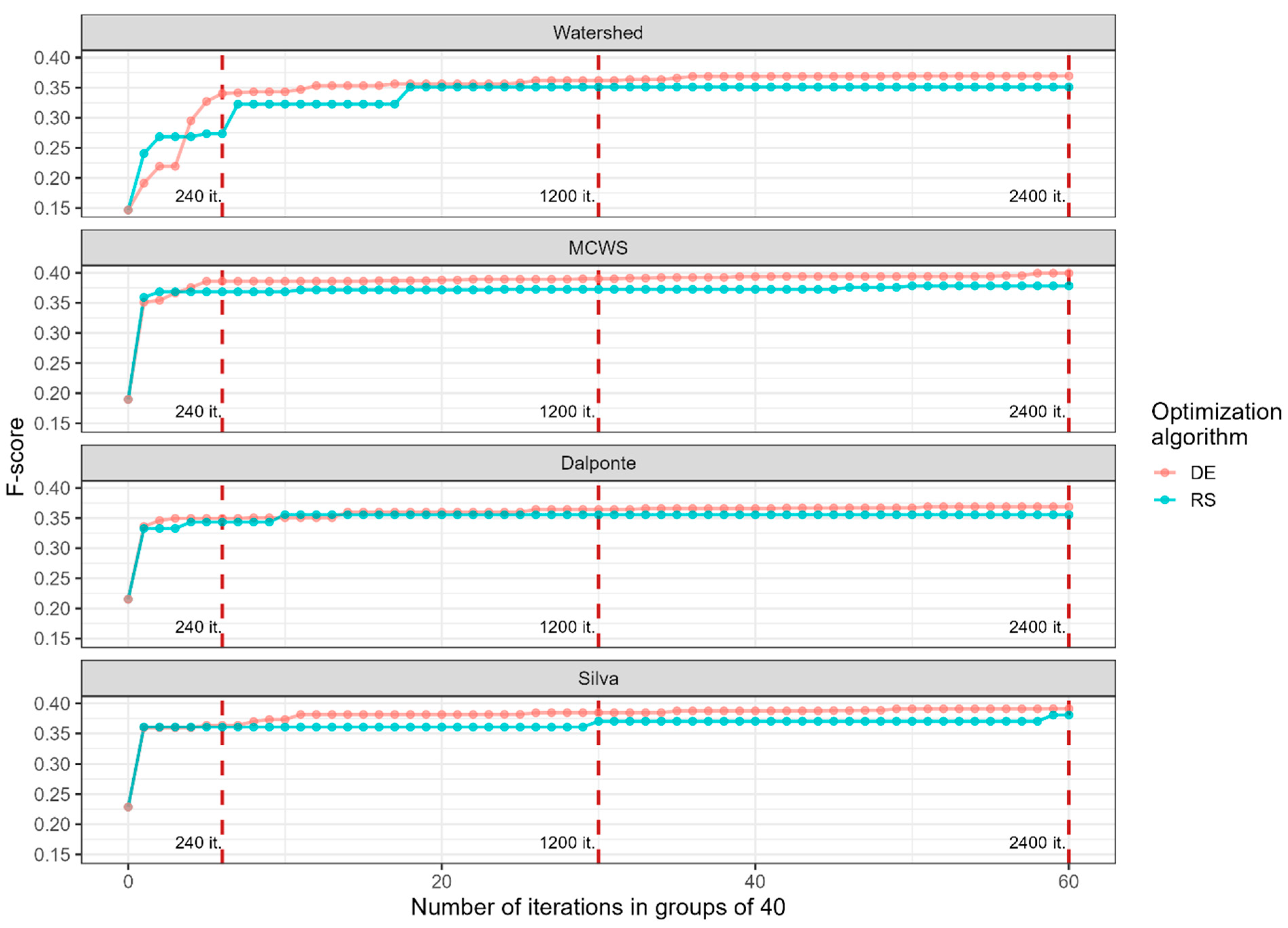 Figure 7). After 300 iterations, segmentation efficiency saw an improvement of 0.12–0.19 F-score points. Consequently, our study’s results indicate that conducting reasonable optimization with random selection of input parameter values can enhance the overall effectiveness of individual tree crown detection and delineation algorithms. Furthermore, applying Differential Evolution may prove to be a sound solution in the long run (>1000 iterations), while Random Search can provide an approximate solution after just a few dozen iterations.