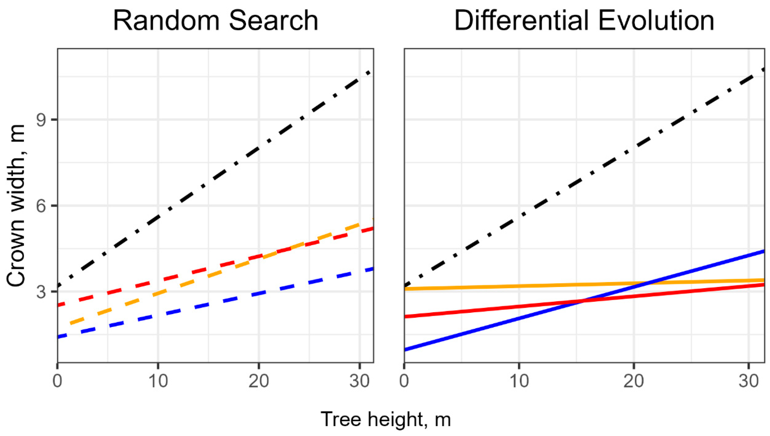 77] proposed using a linear regression with a quadratic model (separate models for deciduous, coniferous, and mixed forests), derived from measurements of 424 trees, to predict crown width based on tree height. Technically, their research integrates these regression models into the Local Maximum Filtering (LMF) function [