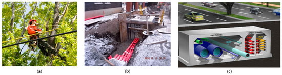 - Multipurpose Utility Tunnels (MUTs). A MUT can be built under the road right-of-way to host power cables in addition to telecommunication cables, gas pipes, municipal water pipes, heating ducts, etc. MUTs have all the advantages of undergrounding in addition to providing better protection and continuous access to all hosted private and public utilities for inspection, maintenance, and repair [164]. Therefore, MUTs greatly reduce the need for repetitive excavations and road closures to access different types of utilities; and will consequently reduce the related social and environmental costs (e.g., traffic congestion). MUTs are a long-term solution for sustainable and resilient underground utility management [165]. However, like undergrounding, their initial cost is high, which requires good coordination between utility owners for MUT initial and operation cost sharing. Moreover, MUTs are more difficult to build in established cities with open-cut methods. Therefore, innovative construction methods should be used to build them (e.g., micro-tunneling) [166]. MUTs have been built in Europe since the 19th century, and are more common in Japan, Singapore, and China [164].