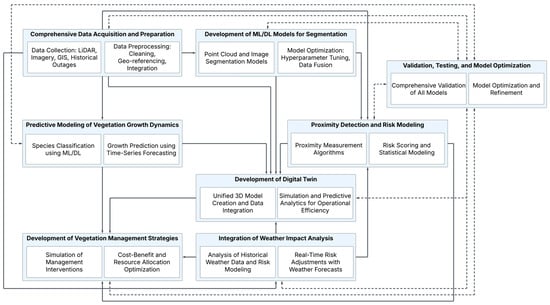 - Digital Twin Development: Unlike segmentation models, which provide valuable but static insights, a digital twin offers a dynamic and continuously updated virtual model of the physical network. Therefore, the following specific steps should be considered: (a) Integrate multiple data sources, including point clouds, satellite imagery, GIS data, and real-time weather information, to reflect current conditions with high fidelity [194,195]; (b) Leverage the digital twin’s ability to simulate various scenarios that impact the power grid, addressing limitations of real-time proximity detection (which identifies immediate risks but lacks foresight into risk evolution); (c) Incorporate prediction of vegetation growth patterns using advanced machine learning and deep learning algorithms, including forecasts of how environmental factors (such as seasonal changes and weather events) influence vegetation dynamics and proximity to power lines; (d) Enhance risk management by integrating predictive analytics with environmental modeling, including assessments of how adverse weather conditions (like storms or high winds) could exacerbate outage risks due to vegetation interference; (e) Simulate the impact of different vegetation management strategies (such as varying pruning schedules or growth inhibitors) to provide data-driven recommendations for preventive actions, enabling maintenance teams to prioritize high-risk areas, optimize resource allocation, and reduce costs by minimizing unnecessary inspections; (f) Foster improved collaboration across departments by using the digital twin as a centralized platform for up-to-date network status, ensuring consistent information for teams in outage management, vegetation management, and maintenance planning to enhance communication and decision-making; and (g) Design the digital twin with a modular architecture to support incremental updates and integration with existing utility systems, justifying the additional effort over static tools (like Google Earth) by emphasizing its interactive, predictive capabilities for strategic planning and risk mitigation beyond basic detection methods.
