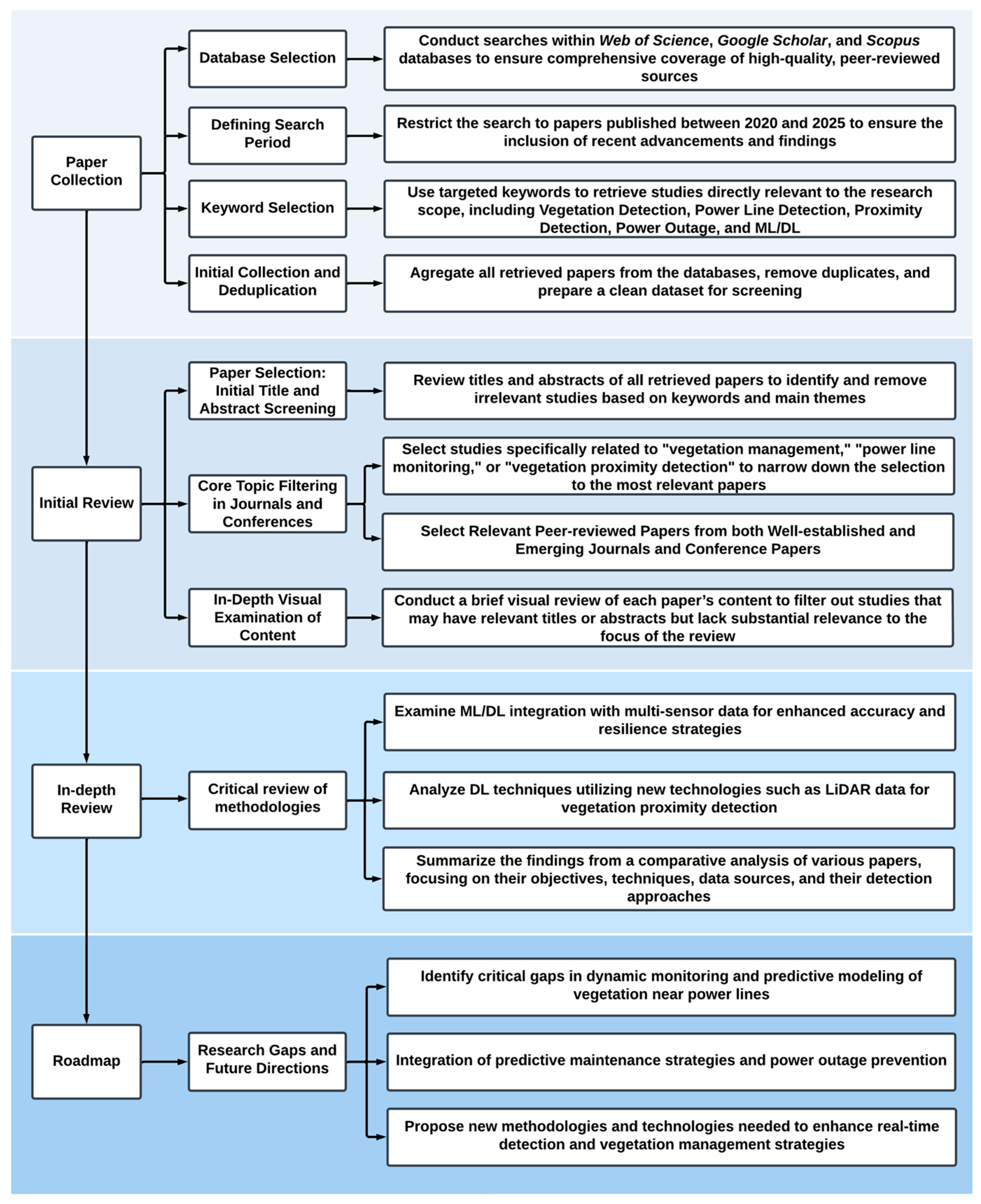 | 7 | Haroun et al. [8] | 2020 | Reviews satellite image techniques for vegetation encroachment detection, focusing on cost-effectiveness and extensive coverage. | Primarily focuses on satellite imagery techniques without analyzing ML/DL applications for dynamic environments. |