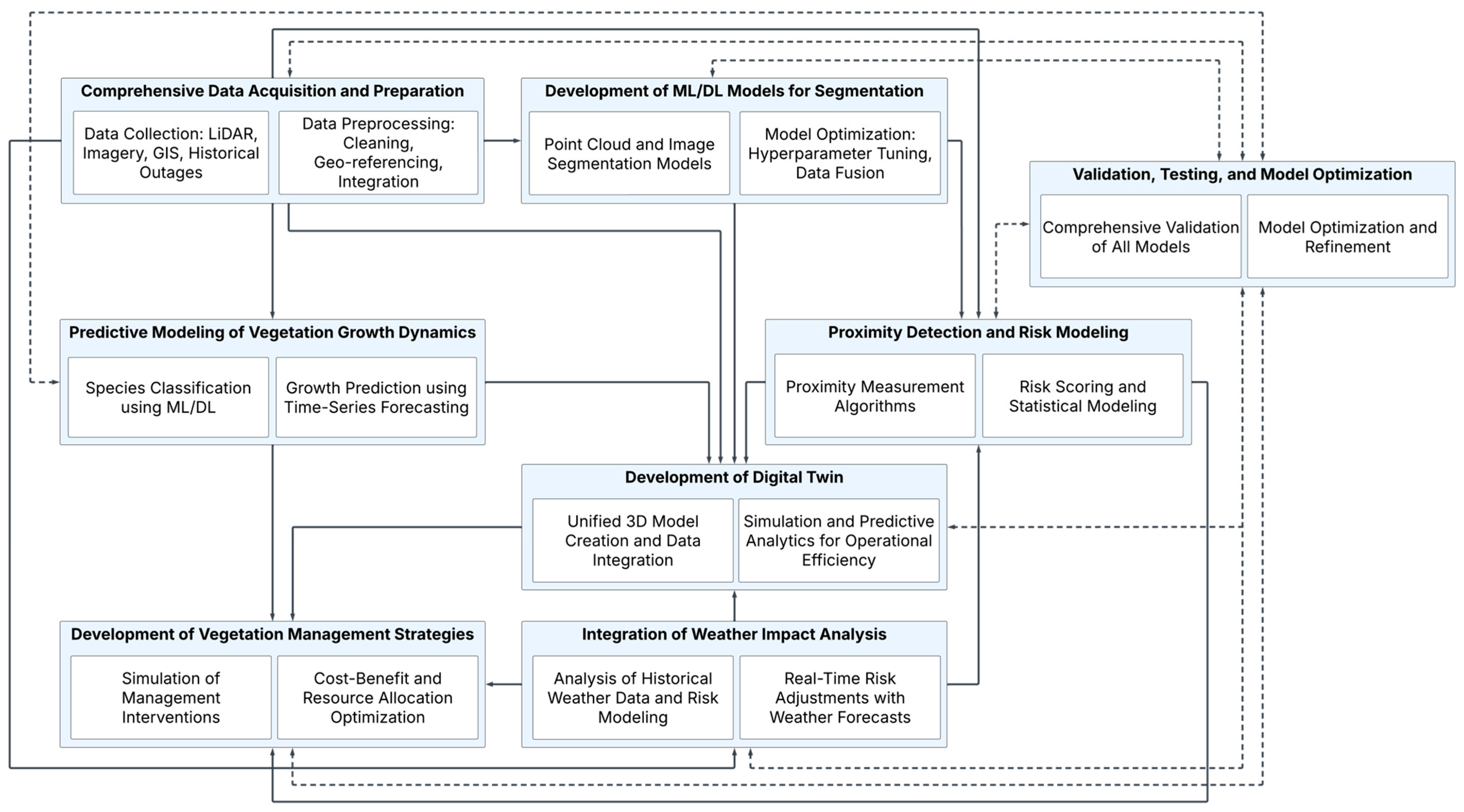 - Validation, Testing, and Model Optimization: Ensuring the reliability and accuracy of the developed models requires accurate validation and testing procedures. Therefore, the following specific steps should be considered: (a) Conduct field studies to validate the accuracy of the ML/DL models and proximity measurements, involving comparisons of model outputs with actual observations gathered through ground surveys, and perform systematic comparisons against ground truth data to assess performance metrics such as accuracy, precision, recall, F1-score, and Intersection over Union (IoU) for segmentation tasks, as well as mean average precision (mAP) for object detection. Additionally, apply hyperparameter tuning methods to statistically evaluate interactions between parameters like batch size and learning rate, ensuring robust model performance [197]; (b) Perform sensitivity analyses to understand how variations in model parameters affect outputs, helping identify the most influential factors and ensuring model robustness under different conditions, and quantify uncertainties in predictions using statistical methods to enhance model reliability and inform confidence levels in decision-making processes; (c) Apply cross-validation techniques, such as k-fold validation, during testing to assess model performance across diverse subsets of the dataset; (d) Implement pilot deployments of the optimized models and digital twin in selected real-world power line segments to evaluate practical performance and gather user feedback from utility operators; (e) Conduct scalability assessments to identify challenges in expanding to larger networks, such as data volume management and integration with existing monitoring systems; and (f) Explore future extensions like incorporation of emerging sensor technologies to ensure the research evolves with technological advancements, and emphasize knowledge transfer through workshops or reports to stakeholders, promoting adoption in the power sector.