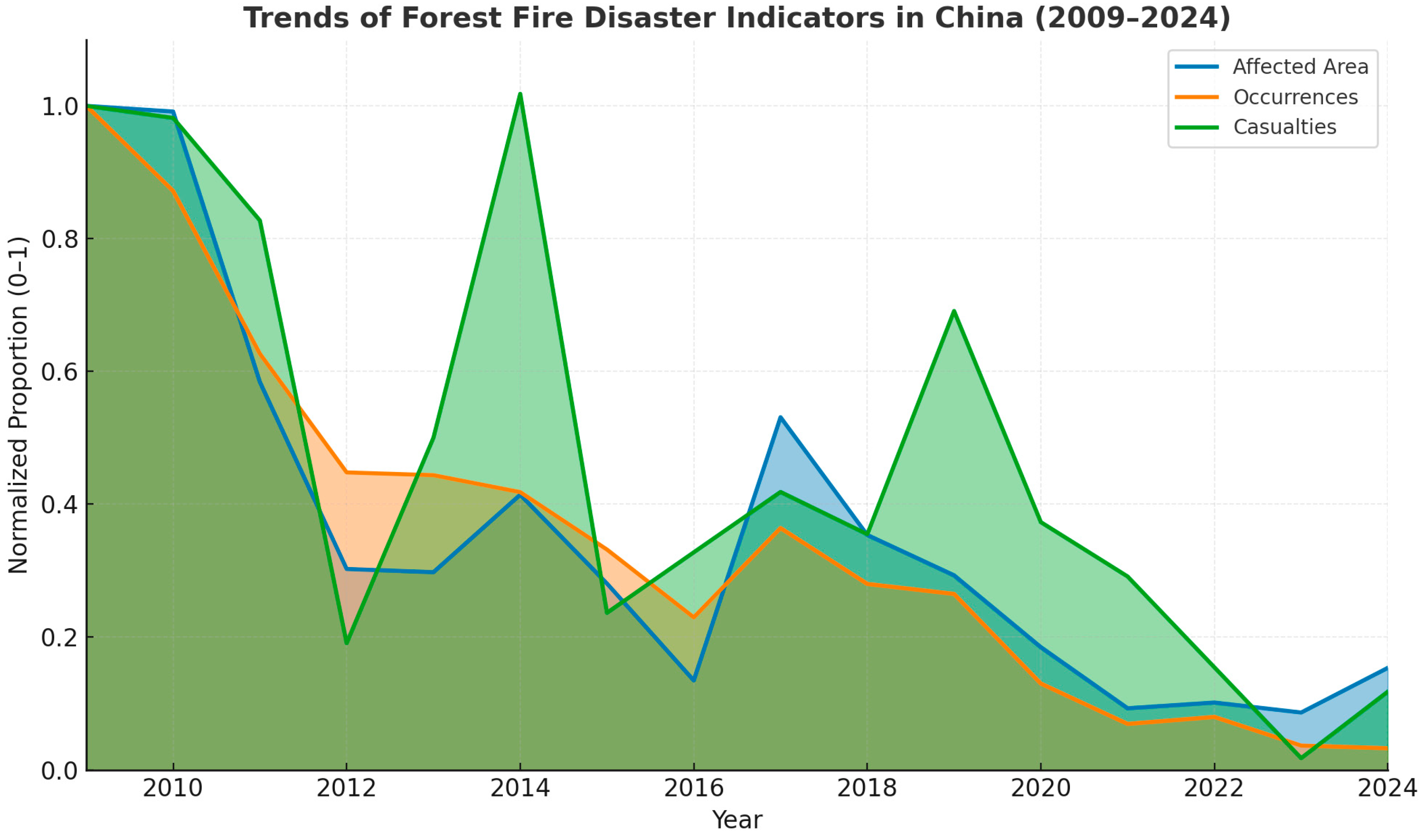 Figure 1 were obtained from authoritative government bulletins and validated reports released by the National Forestry and Grassland Administration of China, as well as other publicly available datasets from official disaster management institutions. These sources were selected because forest fire incident statistics in China are centrally collected and verified by government departments rather than through independent academic surveys. Therefore, although some references [