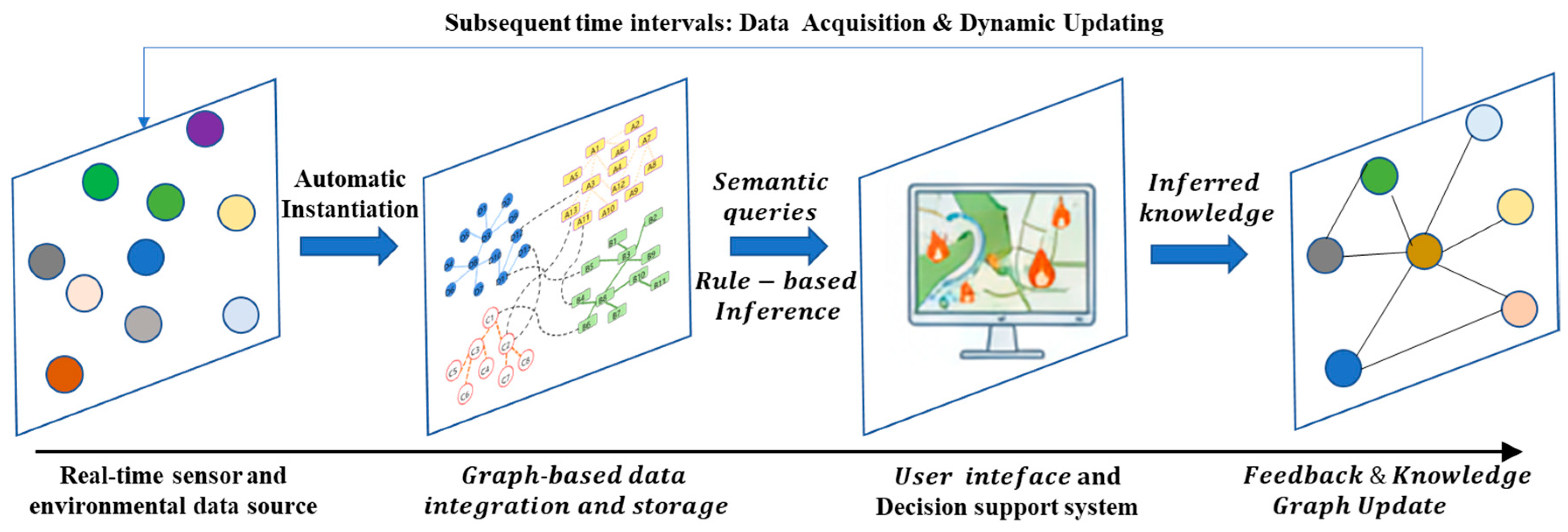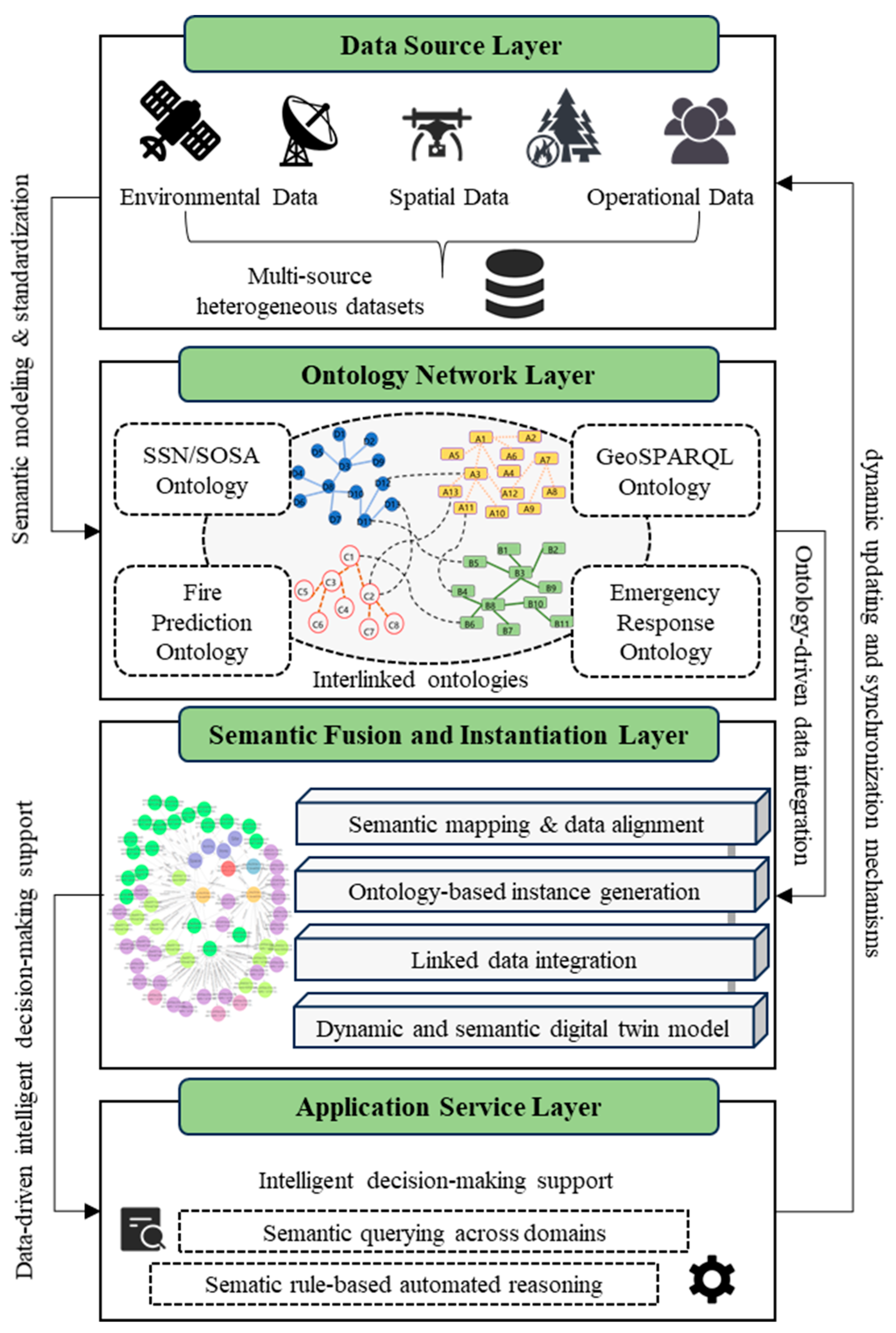 The Application Service Layer provides the intelligent interface between the framework and end users. It offers (1) semantic querying to explore and correlate data across domains and (2) rule-driven reasoning for fire prediction, resource deployment, and emergency planning. Through continuous synchronization between field data and their semantic representation, this layer enables the system to deliver real-time situational awareness, early warning, and decision recommendations. Furthermore, the inferred results and decision outcomes generated at the application layer are utilized to semantically interpret and evaluate incoming real-time data streams, thereby establishing a continuous feedback loop that reinforces the twin’s capability for adaptive learning and data-driven decision refinement. In doing so, it transforms static datasets into a proactive decision-support system that continuously learns and adapts—embodying the operational essence of a semantic digital twin for forest fire management.