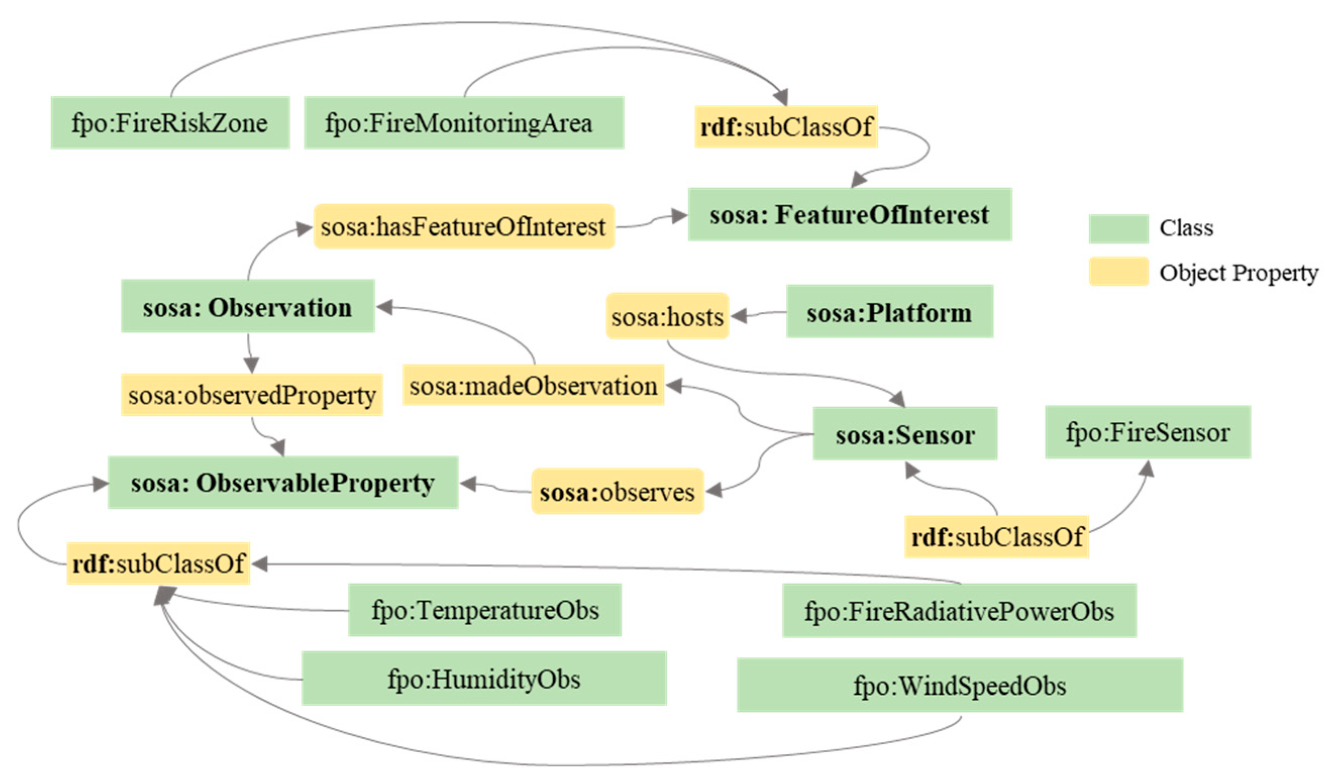 39]. In this study, it was used to model time-series data from remote sensing satellites, meteorological stations, and ground-based environmental sensors. Concepts such as sosa:Observation, sosa:Sensor, and sosa:ObservedProperty were adapted and extended to ensure compatibility with fire-relevant measurements such as temperature, humidity, and wind speed, as shown in
