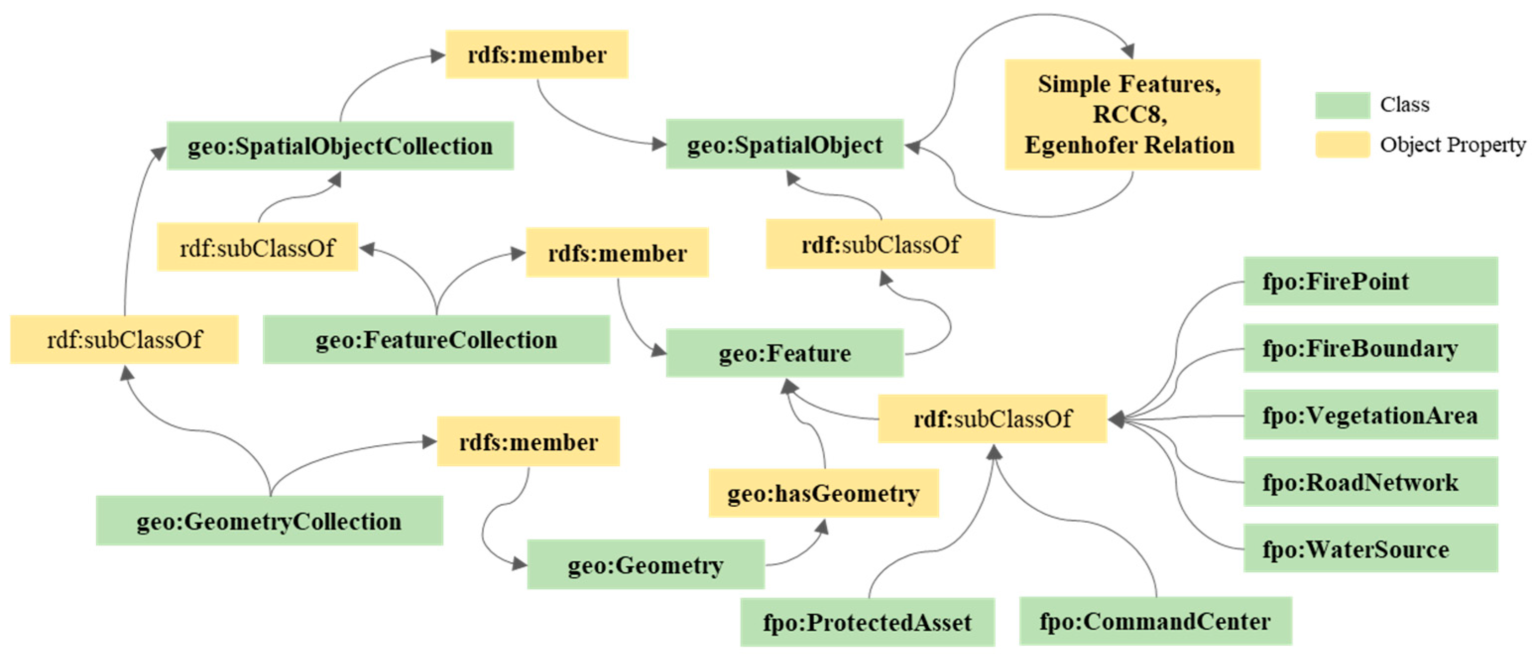 24]. It provides core classes such as geo:Feature and geo:Geometry, and supports topological predicates like sfWithin and sfOverlaps. In this framework, it enables precise spatial modeling of terrain, fire locations, administrative boundaries, and infrastructure, as shown in
