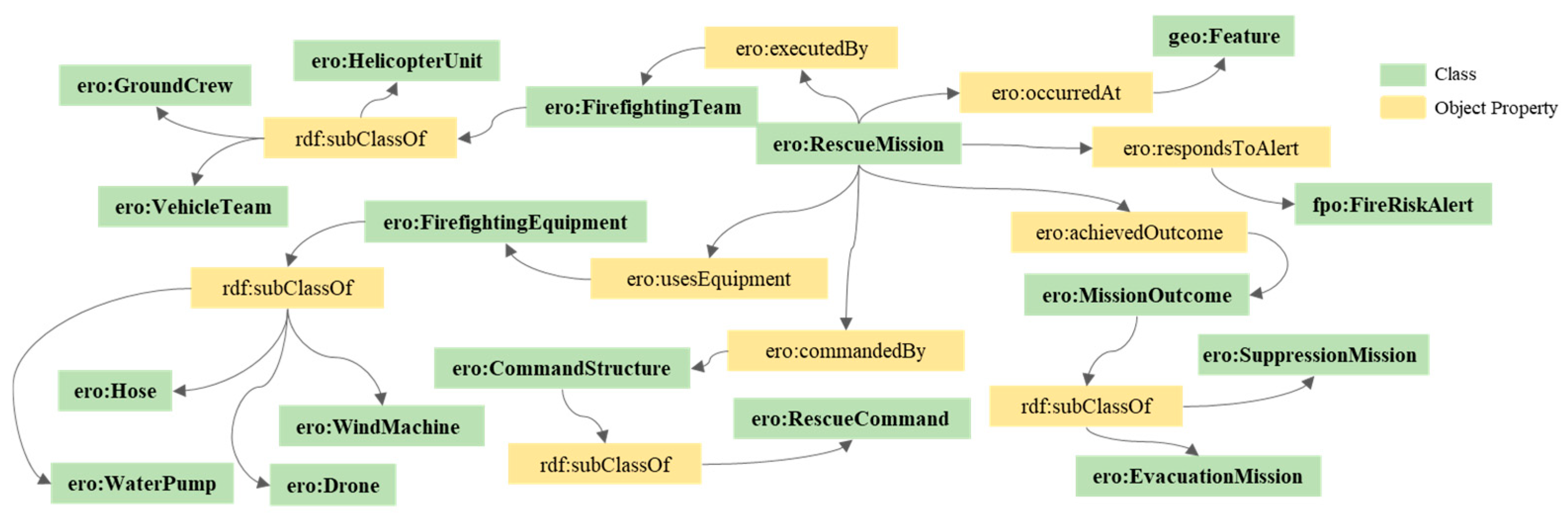 Complementing this, an Emergency Response Ontology (ERO) was created to represent operational knowledge derived from structured rescue mission data. It includes classes such as RescueMission, FirefightingTeam, Equipment, and MissionOutcome, and encodes key attributes such as deployment time, fire area controlled, and team composition, as shown in
