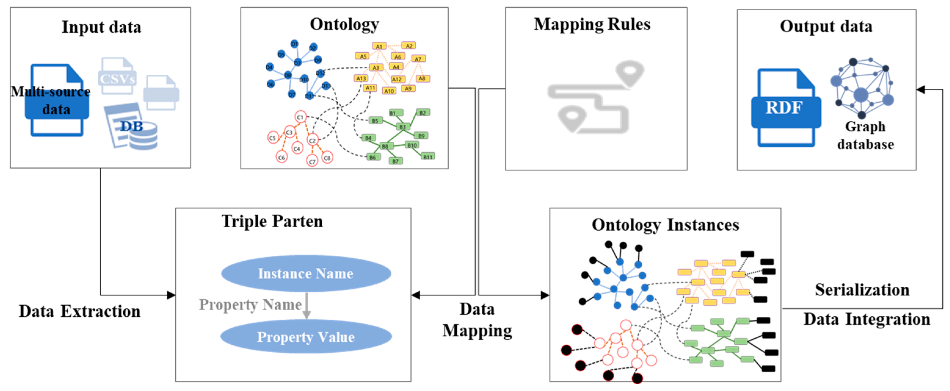 Following the construction of the ontology network, the next step involves transforming raw data into semantically rich knowledge through a structured process of instantiation and linkage, as shown in
