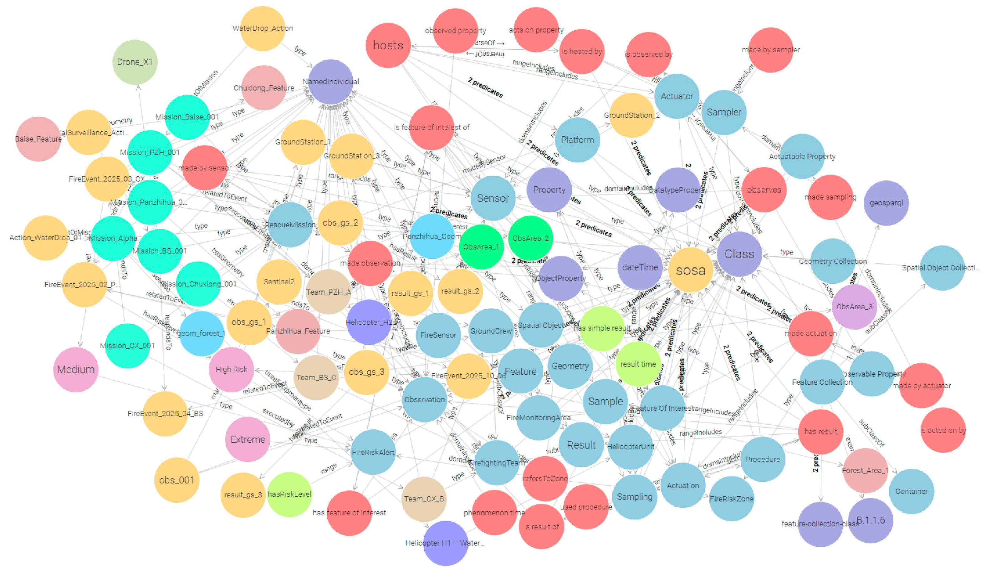Therefore, the present study addresses these gaps by proposing a multi-ontology network—comprising SSN, GeoSPARQL, Fire Prevention, and Firefighting ontologies—that enables cross-domain integration, semantic instantiation, and automated reasoning. This framework bridges predictive fire risk modeling and emergency response decision-making, advancing the evolution of the semantic digital forest from data visualization toward knowledge-centric, reasoning-enabled fire management.