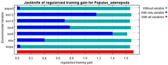 Through an analysis of the jackknife test (Figure 4), percent contribution, and permutation importance, we identified four dominant habitat factors for P. adenopoda based on a hierarchical criterion that prioritized permutation importance due to its robustness. The final selection comprised variables that ranked within the top four in permutation importance and were consistently supported by the other two metrics.