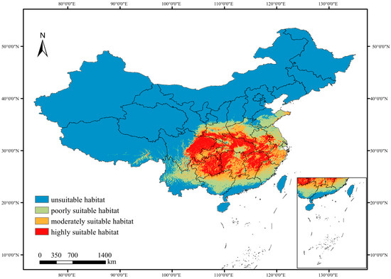 The optimal MaxEnt model simulation revealed that the total suitable habitat area for P. adenopoda under current climatic scenarios is approximately 228.19 × 104 km2, accounting for about 23.94% of China’s total land area. Among these suitable habitats, the highly suitable areas were estimated to cover 73.95 × 104 km2, followed by 66.02 × 104 km2 of moderately suitable habitat, and 88.22 × 104 km2 of poorly suitability habitat (Table 2). Geographically, the suitable habitats are primarily concentrated in southern China, including but not limited to Yunnan, Chongqing, Shaanxi, Sichuan, Guangxi, Jiangxi, Hunan, Guizhou, and Zhejiang provinces (Figure 6). Southeastern coastal regions of China may also fall within the predicted suitable range. Moderately suitable habitats were mainly distributed around the peripheries of the highly suitable habitats, extending into central and eastern provinces. The core areas of highly suitable habitat were located in Guizhou, Chongqing, Hubei, and Hunan provinces.