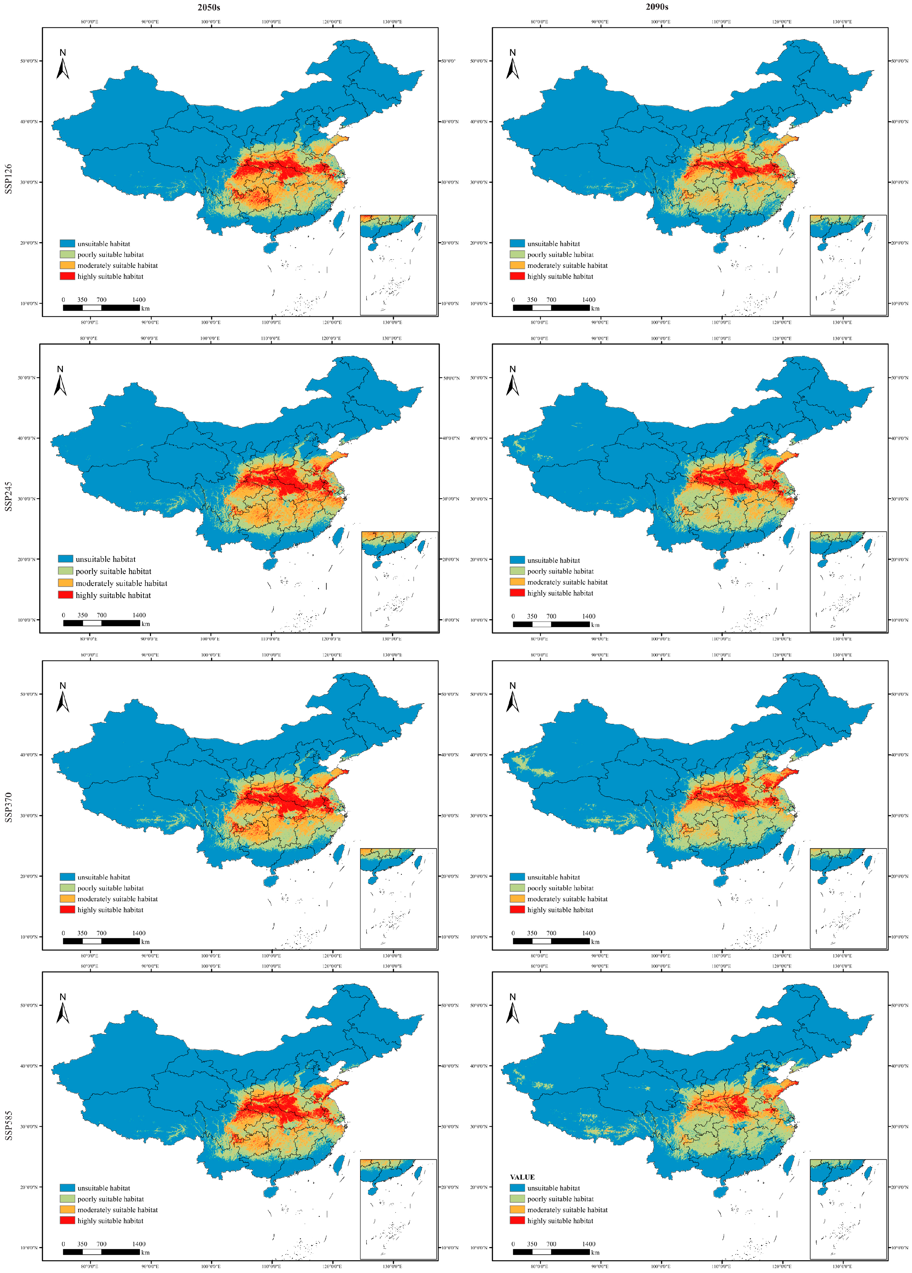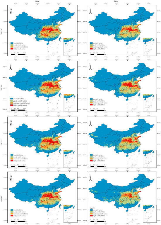 Geospatially, these quantitative changes suggest a potential northward and eastward shift in the distribution centroid, with a pronounced shift from high-quality to low-quality habitats across southern and central China. The core suitable areas are projected to become increasingly fragmented. Similarly, using the maxTSS threshold of 0.25 to convert the continuous probability predictions into binary (suitable/non-suitable) maps revealed a significant future decrease in overall suitable area and a marked contraction in species range (Figure A2). This finding is consistent with the primary results obtained using the Natural Breaks method.