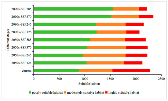 The total suitable habitat area exhibited variation across different future scenarios. Under certain pathways such as SSP370 in the 2090s, a slight increase was observed (reaching 234.50 × 104 km2). In contrast, more extreme scenarios like SSP126 in the 2090s predicted a reduction to 207.31 × 104 km2 (Table 2), reflecting a divergent response to varying climate pathways.