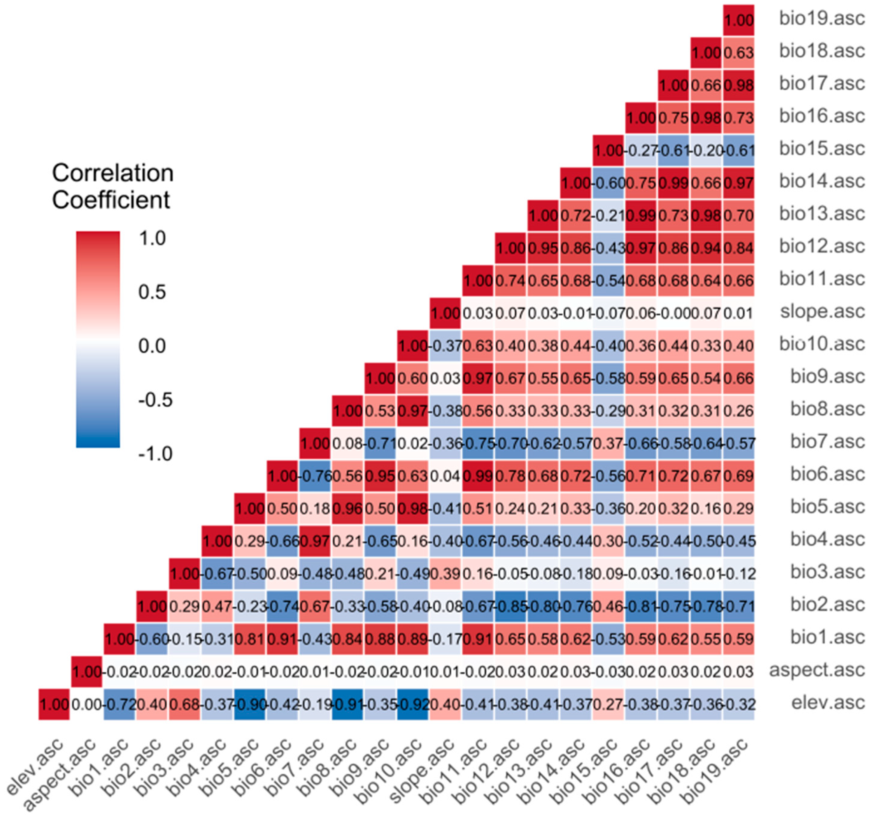 The environmental variables consist of 19 biogenic and 3 topographic factors (Table A1). Climate data were used for both the current period (1970–2000) and future periods (2041–2060, 2081–2100) under four representative concentration pathways (SSP126, SSP245, SSP370, SSP585), covering nine climate scenarios in total. All climate data were obtained from the WorldClim database (http://www.worldclim.org) at a spatial resolution of 2.5 arc-mins [38]. WorldClim was selected as it provides a globally consistent, long-term climatology that is specifically tailored for species distribution modeling studies. While satellite-derived products (e.g., MODIS) offer finer spatial resolution, WorldClim’s interpolation from meteorological stations provides a more direct measure of the climatic conditions experienced by terrestrial plants over a multi-decadal period, which is critical for understanding species’ fundamental niches. The BCC-CSM2-MR climate model from the Coupled Model Intercomparison Project Phase 6 (CMIP6) was selected because it accurately captures historical climate patterns across China [39]. Topographic data, specifically digital elevation models (DEMs) at a 2.5 arc-min resolution, were sourced from WorldClim version 2.1. Slope and aspect were calculated from these DEMs. Using ArcGIS version 10.8.2, all environmental layers were masked and extracted to match China’s boundaries based on the administrative map. These raster layers were then converted into ASCII format for further analysis. We acknowledge that the ~2.5 arc-min spatial resolution, while standard for range-wide studies, may not capture fine-scale topographic microclimates, and the interpolative nature of the dataset introduces inherent uncertainties. The provincial administrative map of China was downloaded from the National Geomatics Center of China (http://ngcc.sbsm.gov.cn/). To reduce multicollinearity and avoid model overfitting [40], Pearson correlation coefficients among the 19 bioclimatic variables and three topographical variables were calculated with ENMTools (Figure 2). When the absolute correlation coefficient between two variables exceeded 0.8, they were considered highly correlated. The variable with the higher contribution was kept for further analysis [41,42]. This variable selection process is essential to ensure model stability and enhance the ecological interpretability of the results by preventing the influence of redundant predictors. Ultimately, seven environmental variables were selected for subsequent studies (Table 1).
