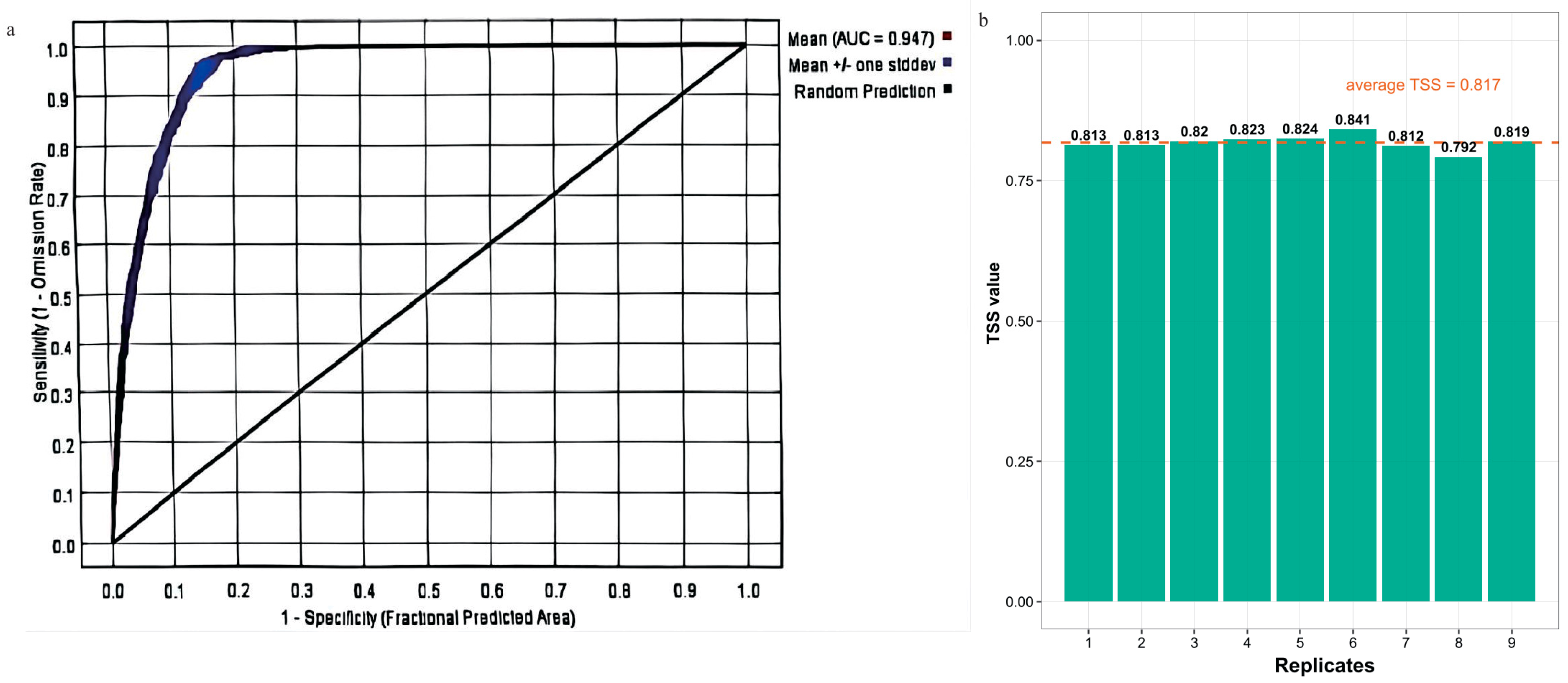 Predictive performance of the Populus adenopoda distribution model. (a) Receiver Operating Characteristic (ROC) curve with Area Under the Curve (AUC) value. (b) True Skill Statistic (TSS) values from 10 bootstrap replicates (mean = 0.817). Both metrics confirm high model accuracy.