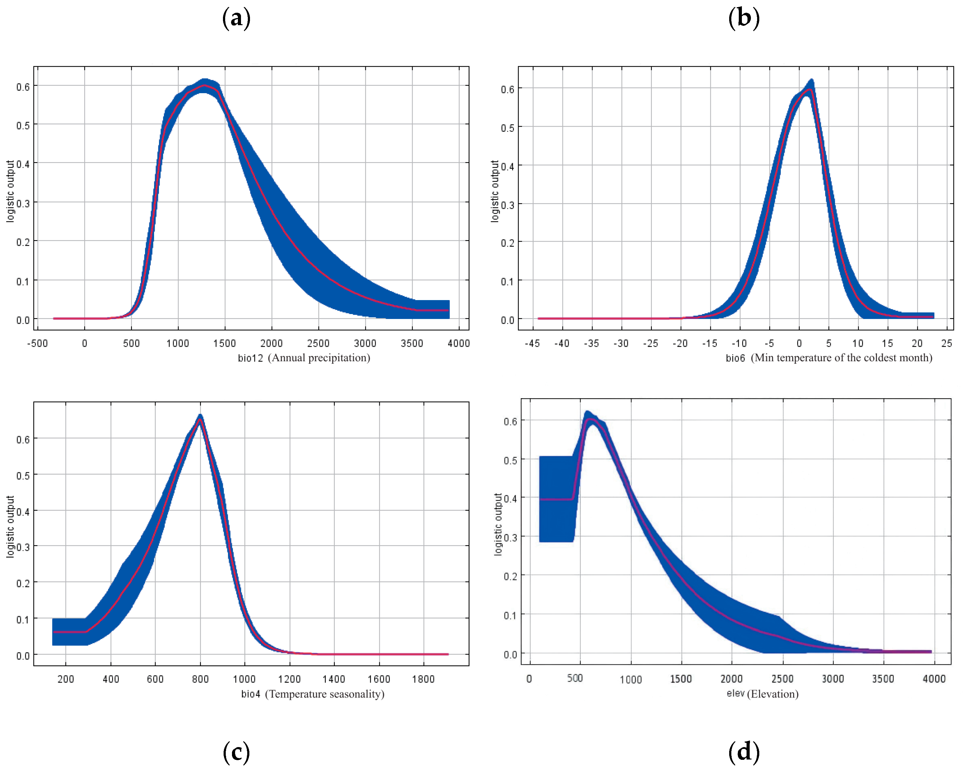 Response curves of Populus adenopoda to the four most influential environmental variables identified by the MaxEnt model. The curves depict the predicted probability of presence as a function of changes in (a) Annual Precipitation (bio12), (b) Mean Temperature of the Coldest Quarter (bio6), (c) Temperature Seasonality (bio4), and (d) Elevation. These curves represent the species’ marginal response to each variable while holding all other variables at their average value. Environmental data were sourced from the WorldClim database.