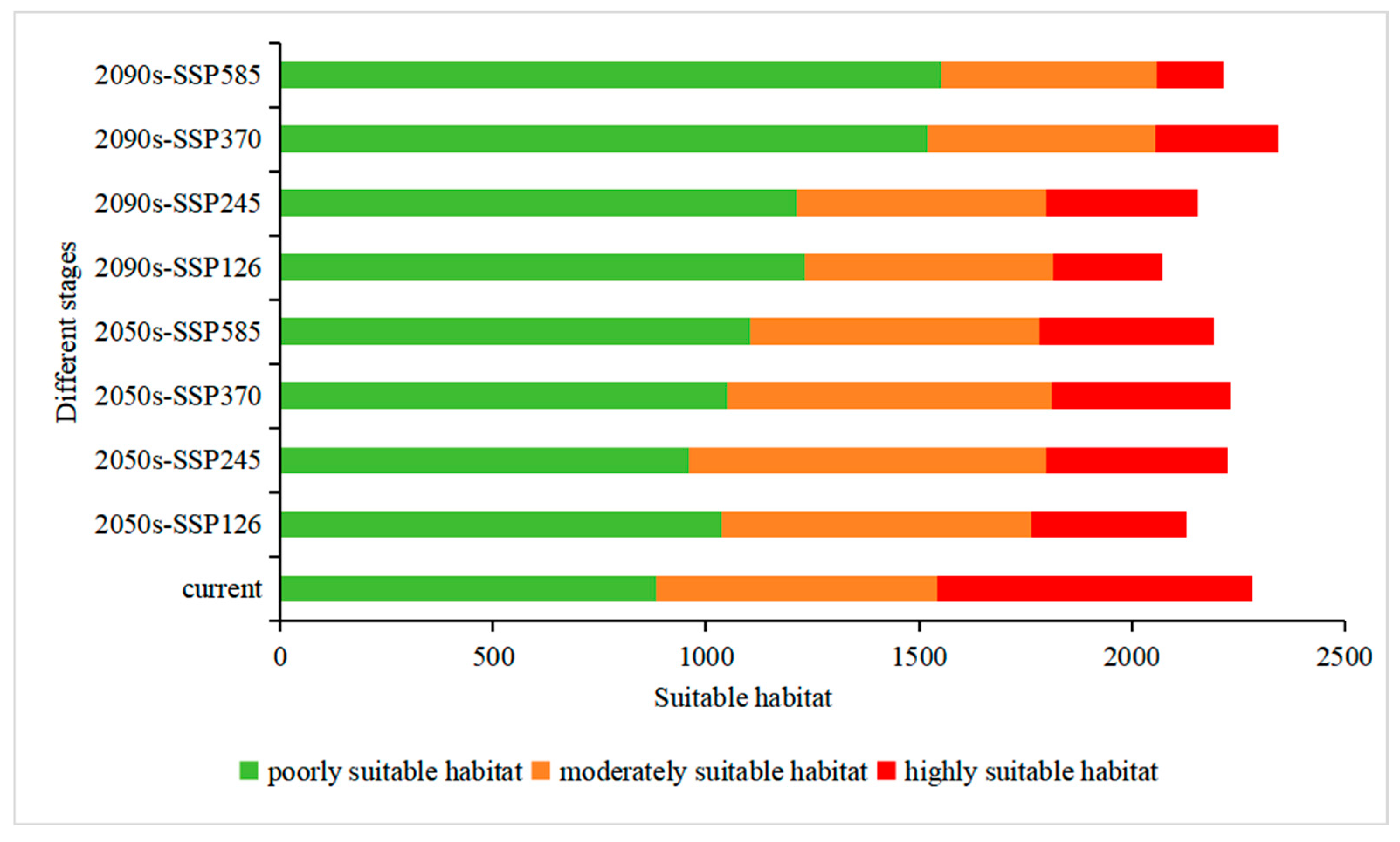 The continuous habitat suitability surface (asc format) generated by MaxEnt was imported into ArcGIS 10.8. We reclassified the suitability index into four distinct grades using the Jenks Natural Breaks Classification Method in the Reclassify tool. This method was selected as it optimally arranges continuous data by minimizing within-class variance and maximizing between-class variance, thereby identifying intrinsic, ecologically meaningful groupings in the probability data, as opposed to arbitrary divisions created by equal interval or quantile methods. The resulting suitability grades were defined as: poorly suitable habitat (<0.08), lowly suitable habitat (0.08–0.27), moderately suitable habitat (0.27–0.46), and highly suitable habitat (0.46–1.0). These threshold intervals, derived from the current distribution data, were then consistently applied to reclassify the suitability maps under all future scenarios to ensure comparability. Finally, the areal extent of each suitability grade was calculated using the ArcGIS Zonal Statistics tool.