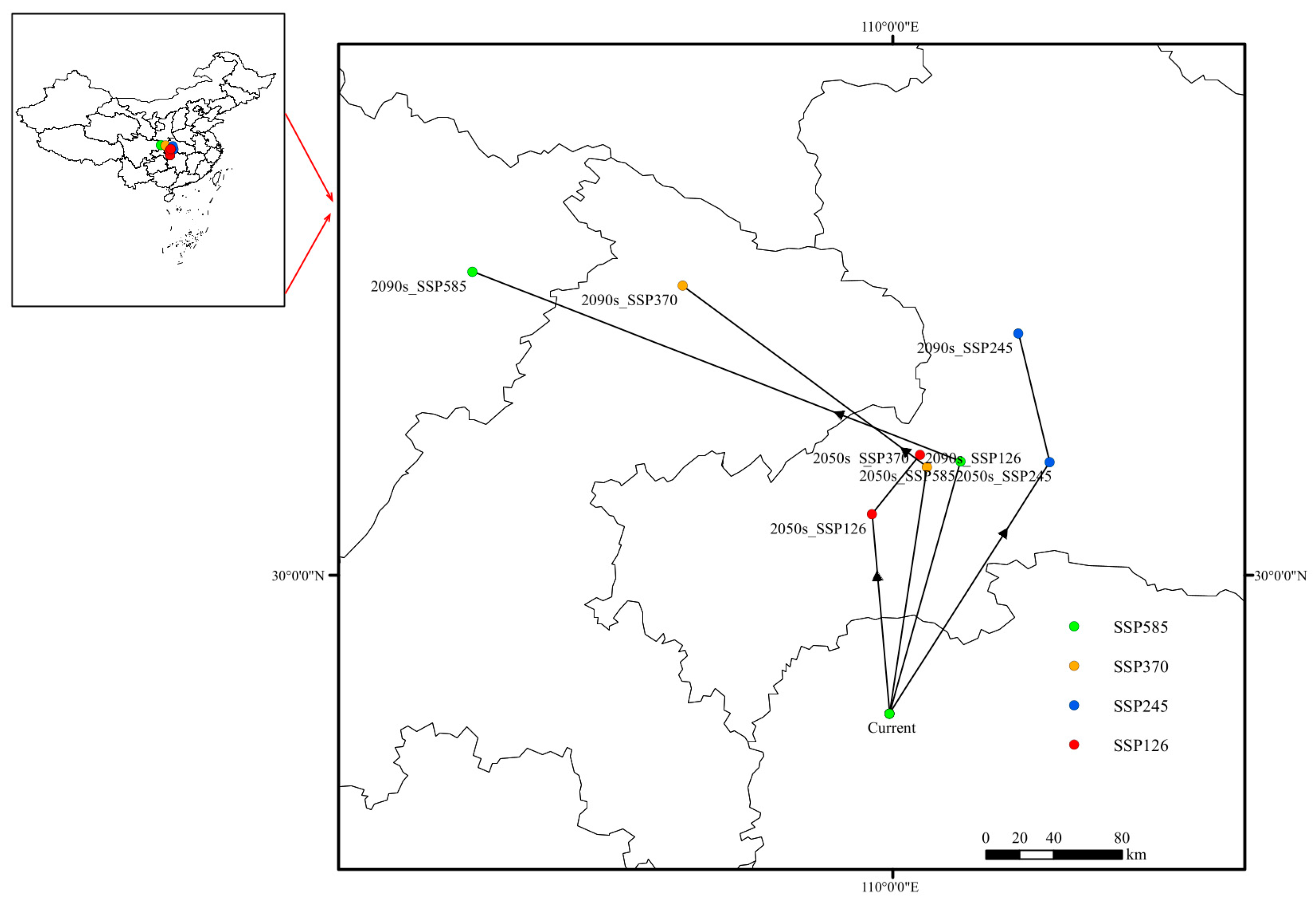 Migration of the distribution centroid for Populus adenopoda under different climate scenarios. The map shows the calculated centroid location for the baseline period and its projected shift in the 2050s and 2090s under four SSPs. The arrows connect the baseline centroid to its future positions, indicating the direction and magnitude of the overall range shift.