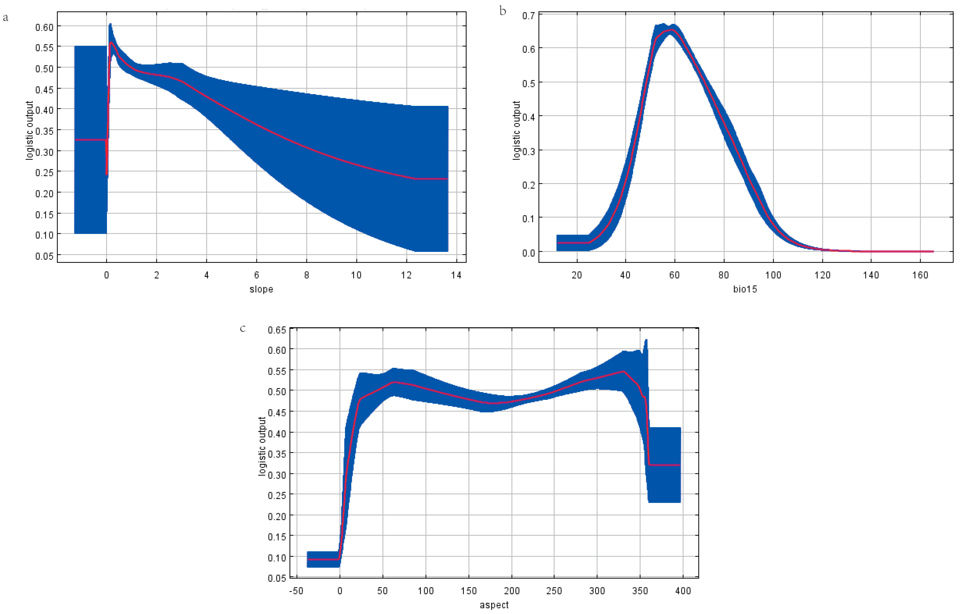Single response curves for the three remaining dominant environmental factors: (a) slope, (b) precipitation Seasonality (bio15), and (c) aspect. The curves depict the modeled relationship between each factor and the predicted habitat suitability, derived from the MaxEnt model. Values on the y-axis represent the logistic probability of presence (ranging from 0 to 1).