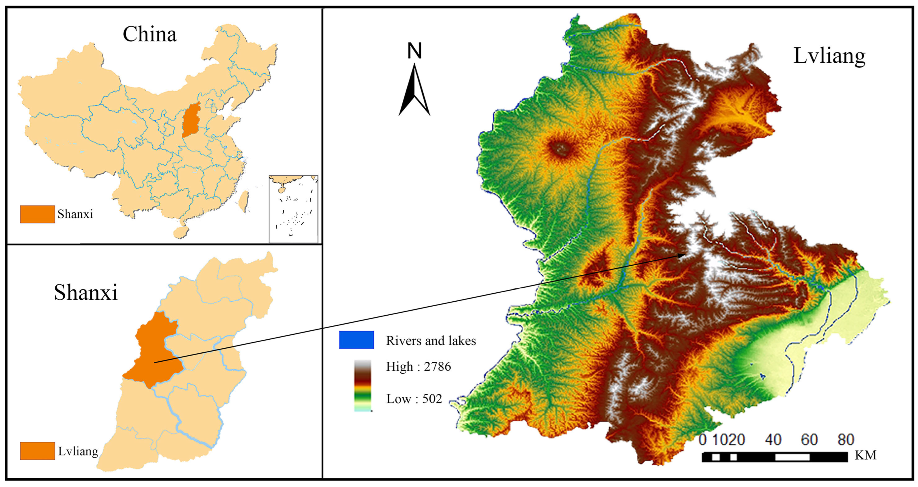 - Xiao, Y.; Tian, S.; Li, Y.; Zhang, Y.; Guo, J. A Study on the Relationship Between the Local Climatic—Geographic Gradient and the Bio-climatic Indices in Guandi Mountains. J. Shanxi Agric. Univ. 1998, 1, 7–11+91–92. [Google Scholar] [CrossRef]