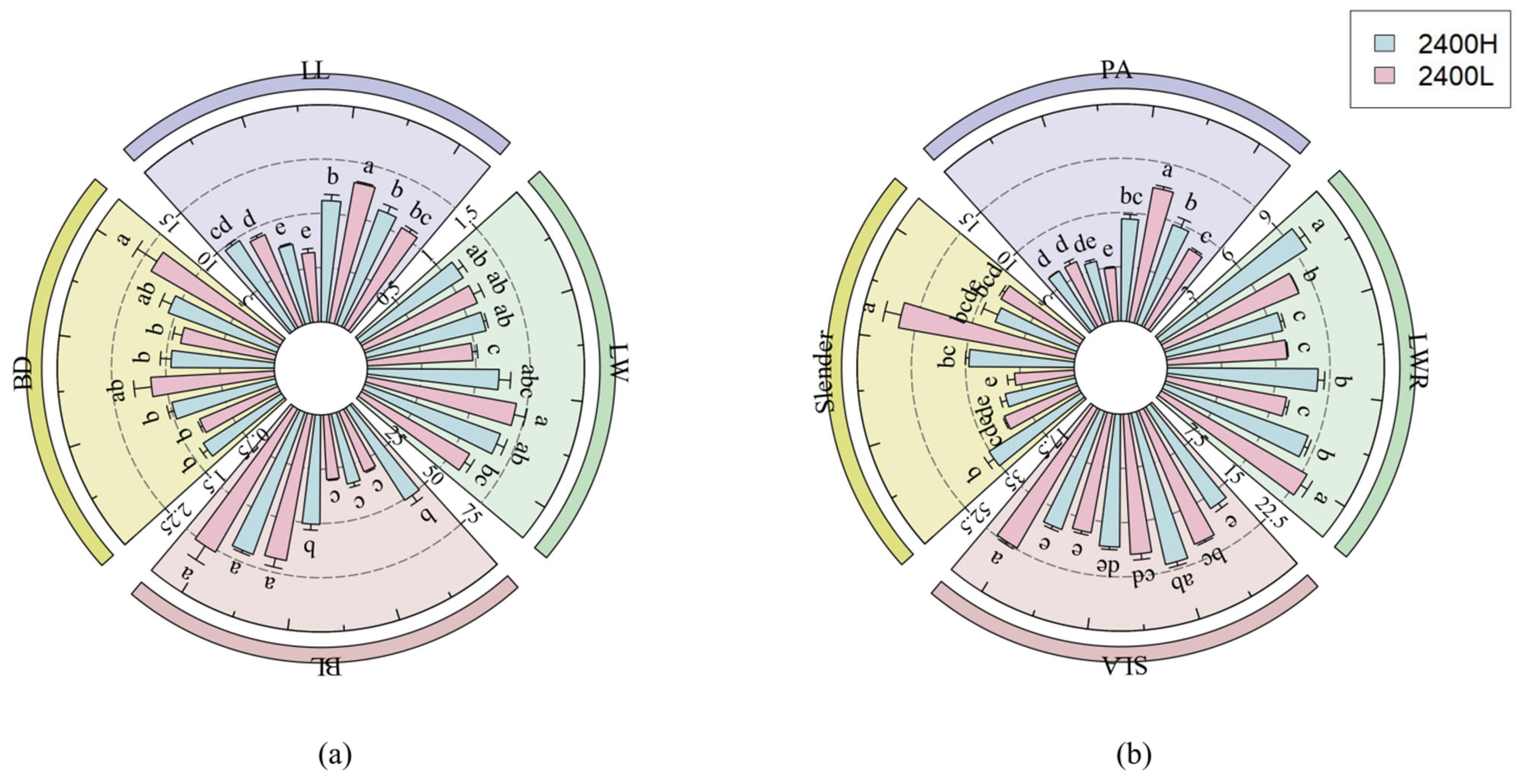 3.1.3. The Influence of Seed Source Altitude and Transplanting Altitude on Leaf Morphological Traits of Larix principis-rupprechtii