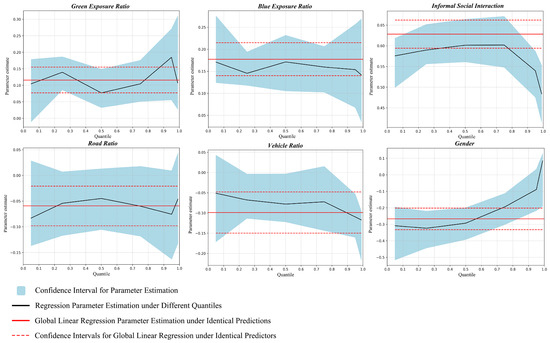- Distribution-specific negative effects. Road and vehicle exposures have negative effects with distinct profiles. The negative coefficients for road exposure are diffuse across quantiles, whereas those for vehicle presence are concentrated at the median. For gender, negative coefficients are most pronounced at the lower tail and attenuate toward higher quantiles. Notably, road ratio has a significant negative effect in the OLS baseline (, ) but becomes non-significant across quantiles in the QR models.