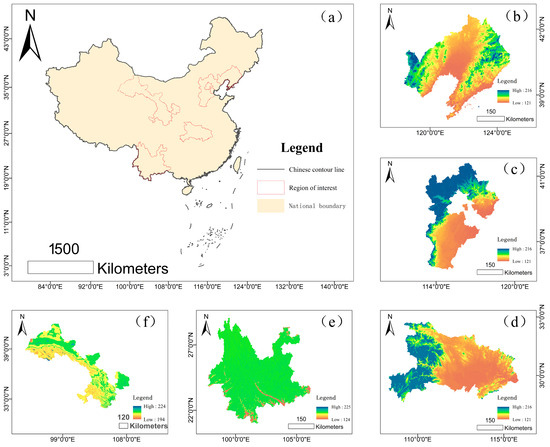 Study area. Note: The map is produced based on the standard map with review number GS(2024)0650 downloaded from the Standard Map Service website https://map.tianditu.gov.cn/ (accessed on 28 October 2025), with no modifications to the base map. (a) Study area distribution; (b) Liaoning Province; (c) Hebei Province; (d) Hubei Province; (e) Yunnan Province; (f) Gansu Province.