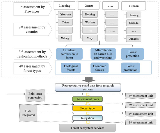 A spatially distributed method was used to estimate the long-term ecological effects of GGP over large areas [30]. The specific steps of the distributed measurement method adopted in this report are (Figure 2): (i) divided into 5 level 1 measurement units according to the provincial administrative divisions; (ii) each level 1 measurement unit is divided into several units according to the counties administrative divisions; (iii) each level 2 measurement unit is divided into 3 level 3 measurement units according to their pre-forestation land types (cropland, barren land, and mountain closing land); and (iv) each level 3 measurement unit is divided into 3 level 4 measurement units according to the functional types of forests established by GGP (ecological forest, economic forest, and brush) (Figure 2). Finally, 6327 ecological units of relatively homogenized ecological service assessment units were determined by combining comparative observations of different stand conditions.